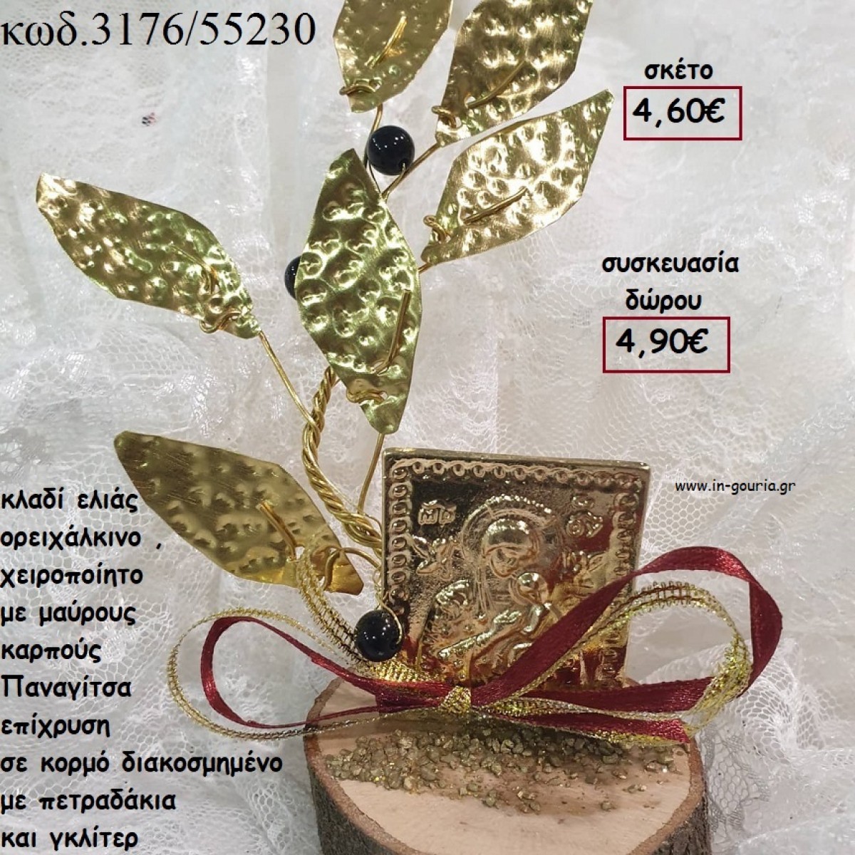 ΚΛΑΔΙ ΕΛΙΑΣ ΜΕ ΜΑΥΡΟΥΣ ΚΑΡΠΟΥΣ ΟΡΕΙΧΑΛΚΙΝΟ ΚΑΙ ΠΑΝΑΓΙΤΣΑ ΕΠΙΧΡΥΣΗ ΣΕ ΚΟΡΜΟ για γούρι - δώρο ΤΖΑ-3176/55230 4.90€!!!