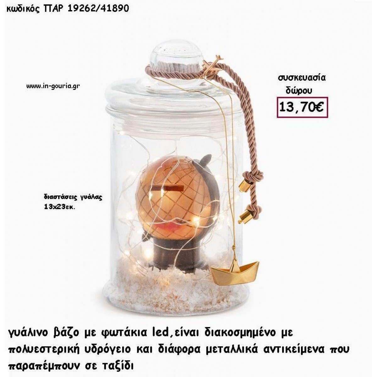 ΥΔΡΟΓΕΙΟΣ ΣΕ ΓΥΑΛΙΝΟ ΒΑΖΟ ΜΕ LED ΦΩΤΑΚΙΑ για γούρι - δώρο ΠΑΡ-19262/41890 13.70€
