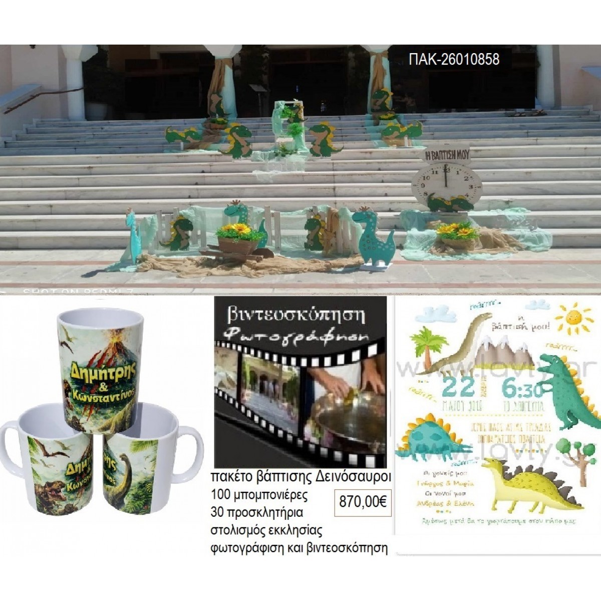 ΔΕΙΝΟΣΑΥΡΟΙ πακέτο βάπτισης 100 μπομπονιέρες 30 προσκλητήρια στολισμός εκκλησίας φωτογράφιση βιντεοσκόπηση ΠΑΚ-26010858 870.00€!!!