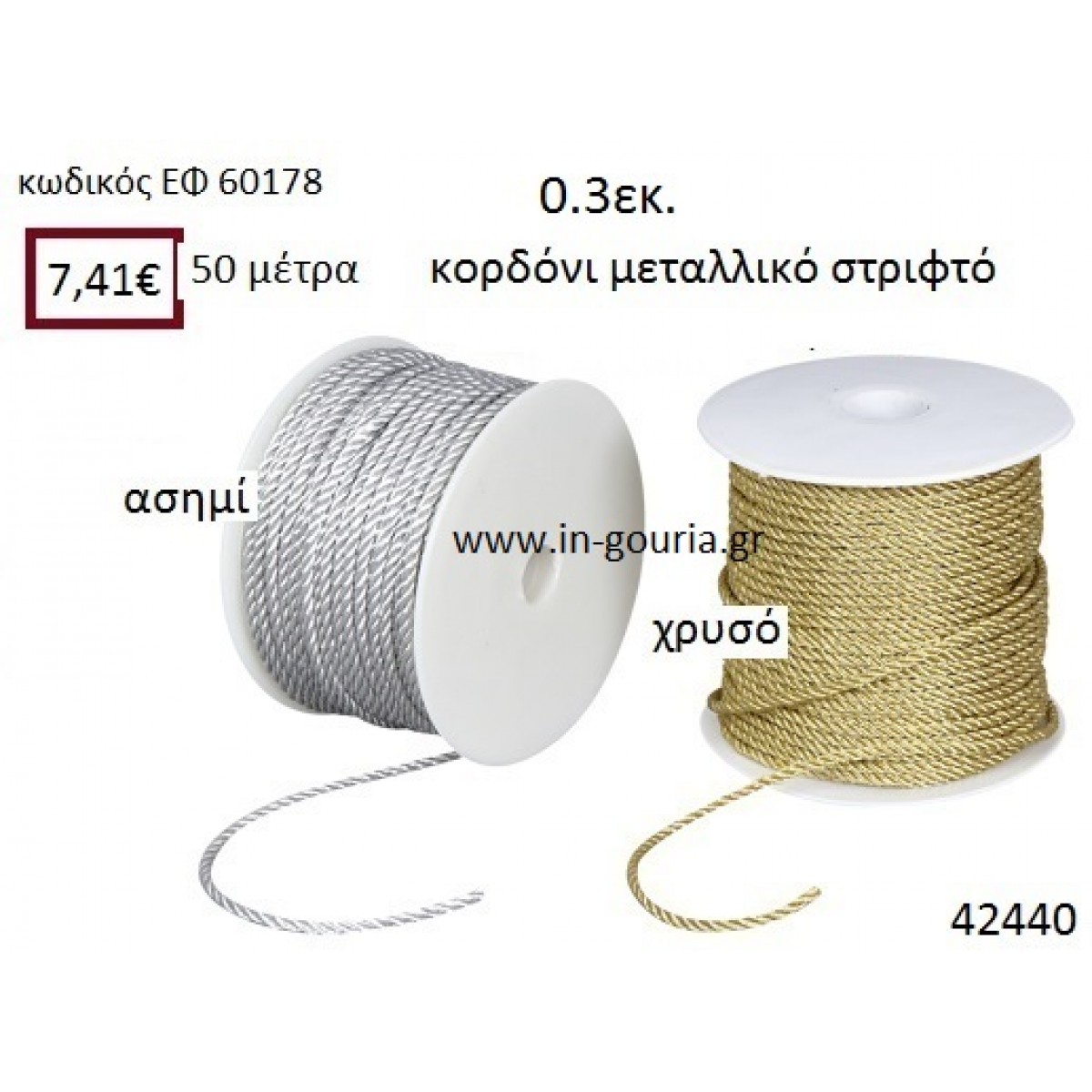 ΚΟΡΔΟΝΙ ΜΕΤΑΛΛΙΚΟ ΣΤΡΙΦΤΟ 50 μέτρων 0.3εκ. για γούρια-αμπαλάζ ΕΦ-60178