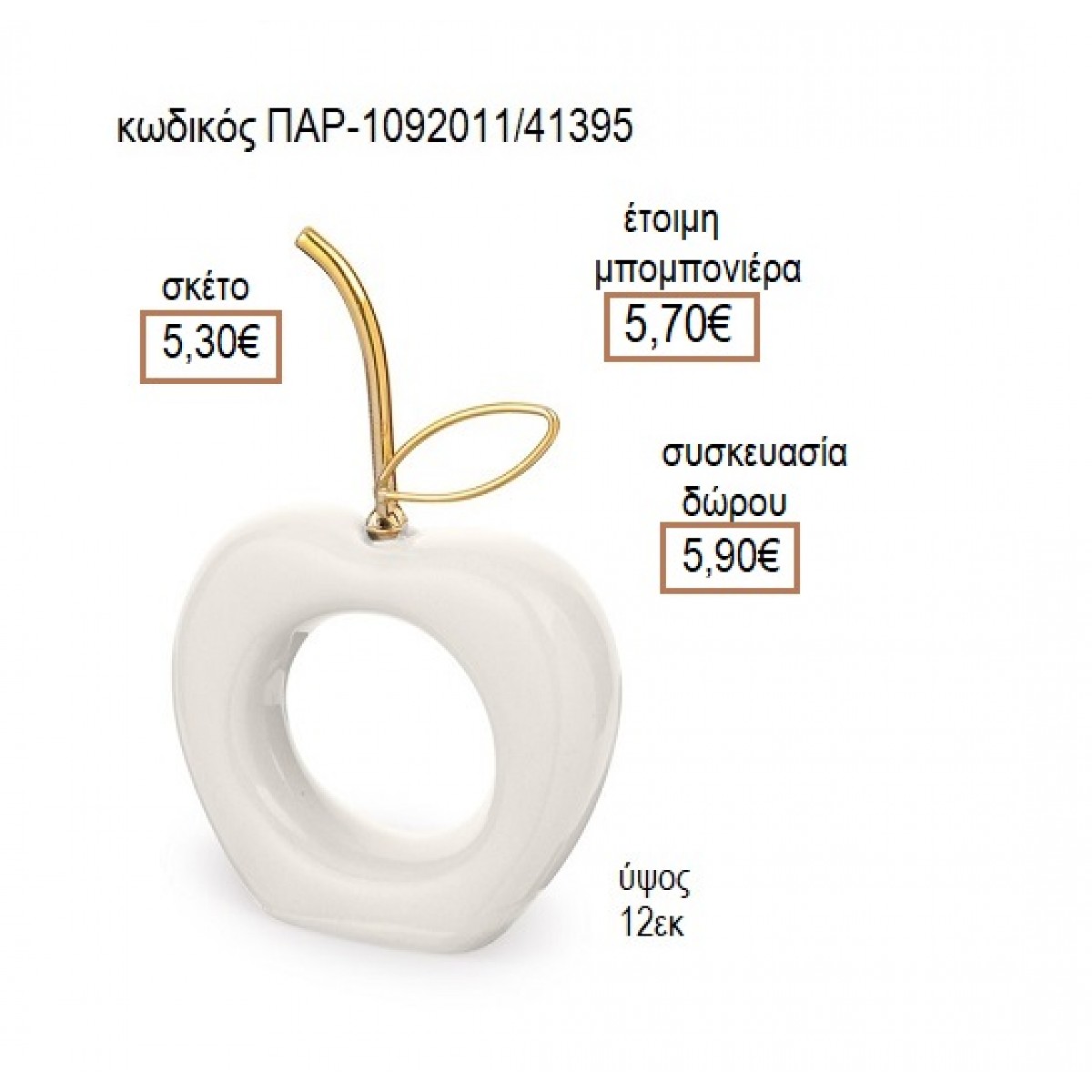 ΜΗΛΟ ΠΟΡΣΕΛΑΝΙΝΟ ΣΕ ΛΕΥΚΟ ΧΡΩΜΑ ΜΕ ΜΕΤΑΛΛΙΚΟ ΧΡΥΣΟ ΚΟΤΣΑΝΙ για μπομπονιέρες γούρια δώρο ΠΑΡ-1092011/41395 5.30€!!!