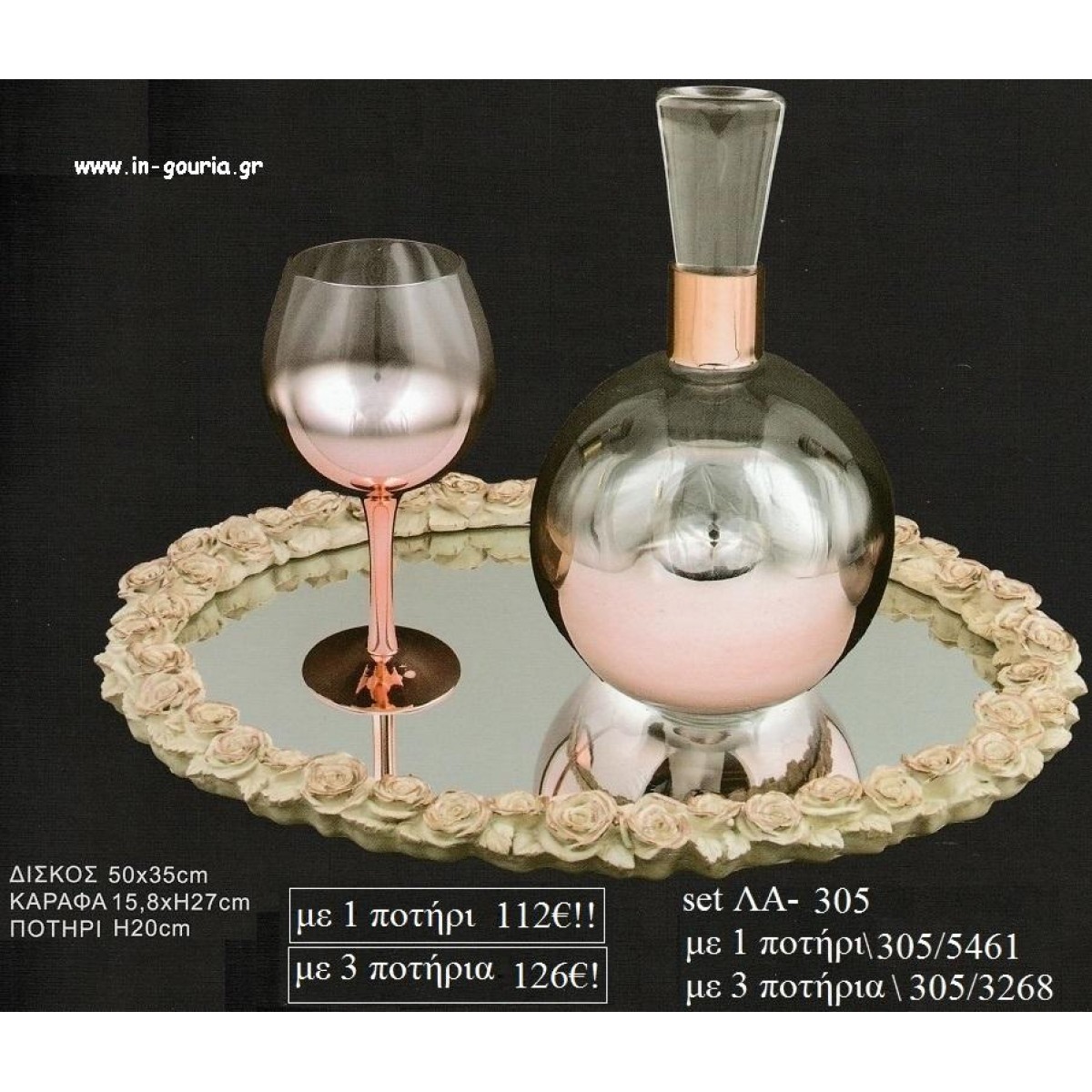 Το σετ περιέχει 1 καράφα , 1 ποτήρι κρασιού και 1 δίσκο.